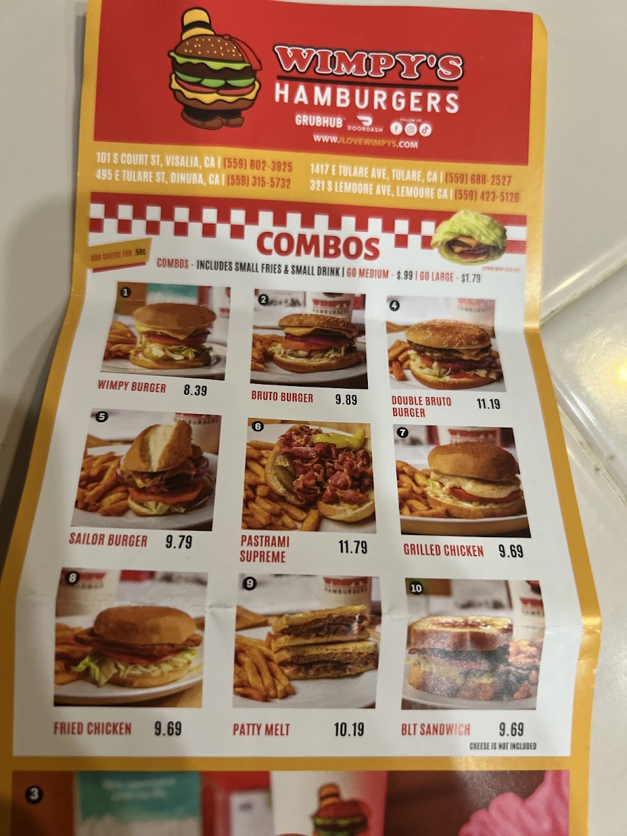 Introducing Wimpy's Hamburgers, a hidden gem located at 321 S Lemoore Ave, Lemoore, CA. With a menu designed to satiate burger lovers, Wimpy's offers a variety of mouthwatering options that highlight quality and taste. Their signature Wimpy Burger Combo—featuring mayo, ketchup, mustard, and fresh toppings—is a fan favorite, paired perfectly with a small fries and drink for just $11.19.